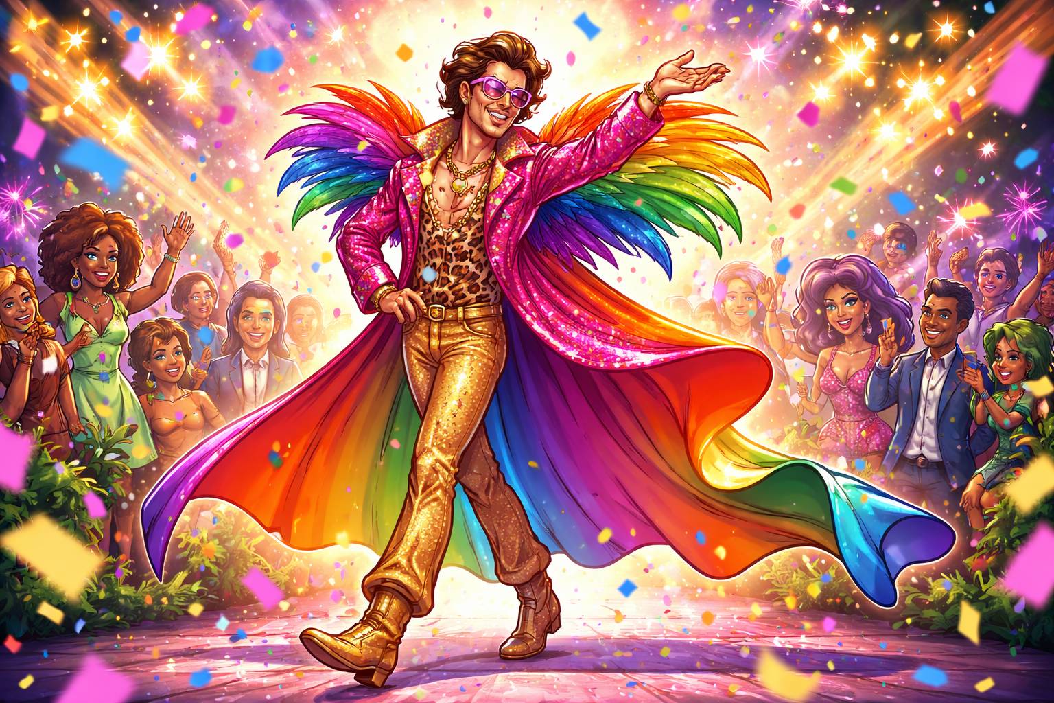 Example: His flamboyant style of dressing made him stand out in every crowd.