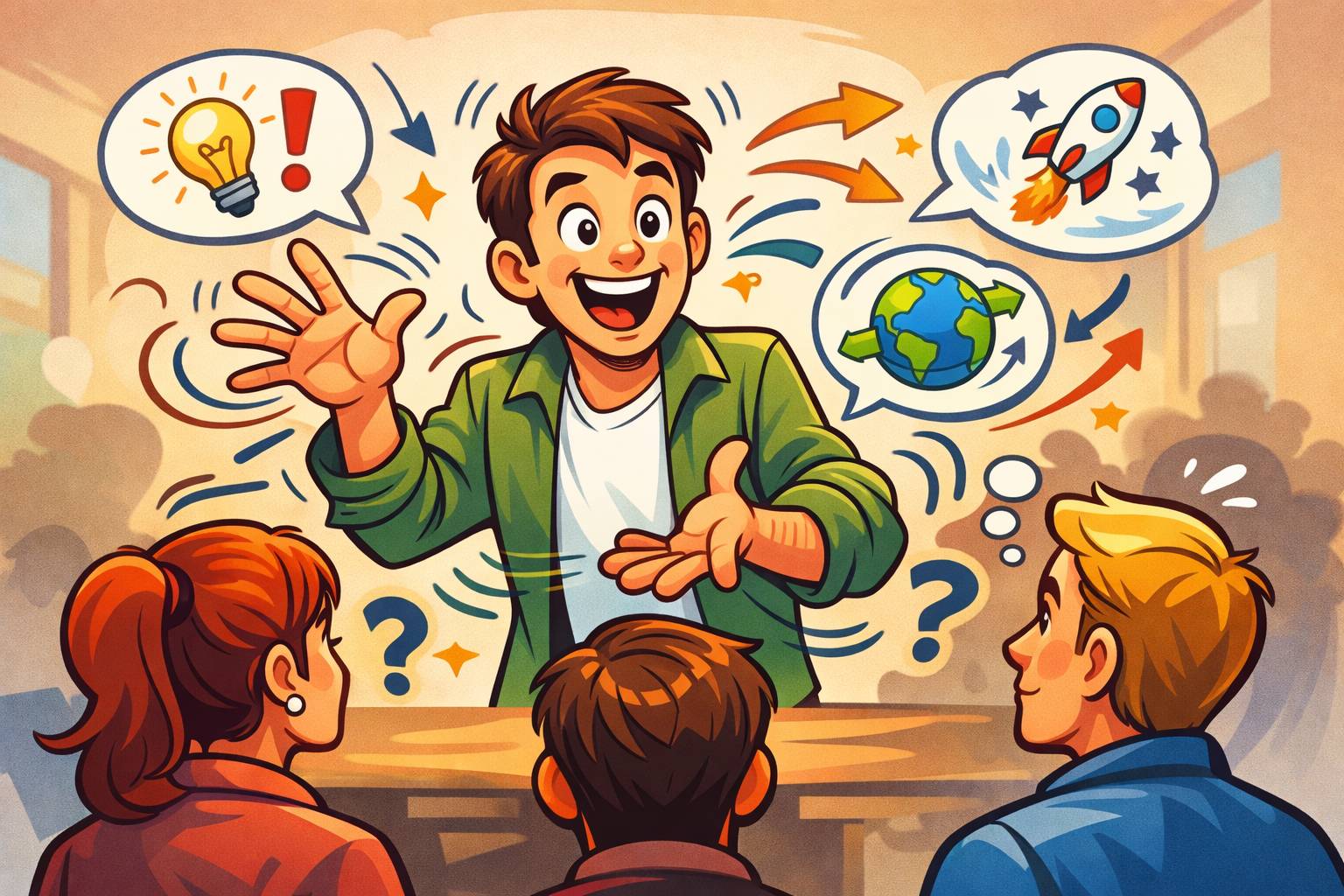 Example: He began to gesticulate wildly to explain his point across the noisy room.