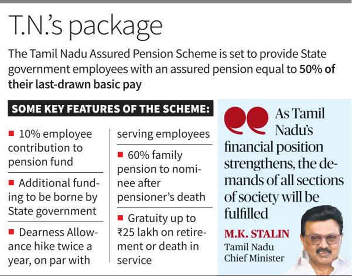 Tamil Nadu Chief Minister M.K. Stalin on Saturday announced the new Tamil Nadu Assured Pension Scheme (TAPS) for State government employees. Under the new arrangement, State government employees will be provided with an assured pension equal to 50% of their last-drawn basic pay.The State government made the announcement after taking into consideration a report submitted recently to the Chief Minister by a three-member Pension Committee headed by Additional Chief Secretary (Rural Development and Panchayat Raj) Gagandeep Singh Bedi, which studied various pension schemes and arrived at a suitable model for Tamil Nadu.